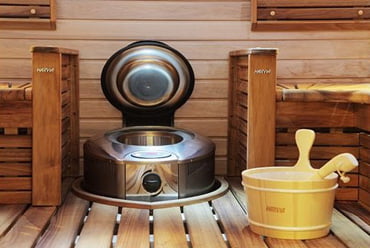 Krosnelę galima įmontuoti į pirties gultus naudojant nerūdijančio plieno apvadą. Krosnelėje telpa iki 100kg akmenų.