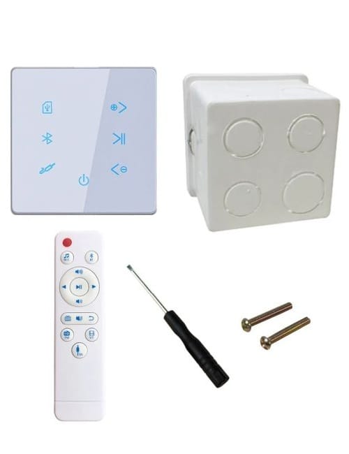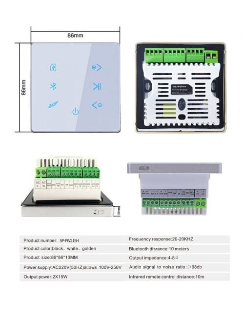 Išmanūs namų garso sistemos mini sieniniai „Touch Key“ Bluetooth stiprintuvo techniniai parametrai:● Maitinimas: AC 110V–250V (50 Hz)● Varža: 4–8 Ω● Išėjimo galia: 2 × 15 W● Audio S/N santykis: ≥ 98 dB● Dažnių diapazonas: 20–20 kHz● Infraraudonųjų spindulių nuotolinio valdymo atstumas: 10 m● „Bluetooth“ veikimo atstumas: 10 m● Gaminio dydis: 86 × 86 × 10 mm● Montavimas: 86 mm standartinė instaliacinė dėžutėFUNKCIJOS:Garso formatų palaikymas:MP3, WAV, APE ir kt.Bluetooth funkcija:Palaikomas išorinių „Bluetooth“ įrenginių (pvz., telefonų) susiejimas garso atkūrimui.Išorinis garso įėjimas:Palaiko išorinio garso šaltinio prijungimą ir sustiprintą išėjimą.Atminties kortelės funkcija:Palaiko išorinę TF kortelę (iki 32 GB).USB funkcija:Galima prijungti USB laikmeną (iki 32 GB) ir lengvai kurti foninės muzikos erdvę namuose.Garsumo reguliavimas:15 lygių elektroninis garsumo reguliavimas.Atminties funkcija:Įrenginys įsimena paskutinę grojimo būseną prieš išjungiant.KOMPLEKTACIJA:1 × sieninis stiprintuvas1 × nuotolinio valdymo pultas1 × montavimo dėžutė, laikiklis ir varžtaiPagrindinio įrenginio montavimo ir nuėmimo instrukcijos:Reikalinga 86 mm instaliacinė dėžutė, gylis – 57 mm.Šiam gaminiui naudoti laidai: daugiagyslė varinė viela, koaksialinis kabelis, garso laidai.