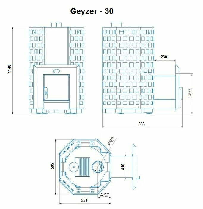Krosnelė Geyser turi unikalią uždarų akmenų dėtuvę, kuri leidžia akimirksniu pripildyti pirties patalpą lengvu, smulkiadispersiniu garu, sukuriant „garų pyragą“ po lubomis ir idealų mikroklimatą garinėje patalpoje.Garo patrankos paglba, vanduo paduodamas į karščiausią centrinę uždarų akmenų dėtuvės dalį. Uždara akmenų dėtuvė laižoma liepsnos, įkaitina akmenis iki 600 °C temperatūros, todėl pilant vandenį gauname 60 °C šilumos ir 60 % oro drėgmės.Pirties krosnyje „Geyser” yra didelis kiekis akmens, kuris leidžia pašalinti konvekciją ir apsaugoti nuo infraraudonųjų spindulių, suteikiant tik minkštą šilumą nuo akmenų ir krosnies. Krosnis yra ekonomiška ir paprasta naudoti, ją lengva įkaitinti, gaunama galimybė naudoti smulkiadispersinį garą, kuris įkaitinamas virš 400°C, ir įprastus 200°C garus. Krosnelė Geyser suteiks nepamirštamą laiko praleidimo garinėje potyrį, tai idealus sprendimas Jūsų pirčiai.Viršutinės krosnies plokštės plieno storis 8 mm, labiausiai termiškai apkraunamose vietose 12 mm, kas užtikrina ilgaamžiškumą dirbant aukštoje temperatūroje.Krosnelės instrukcijaGeyzer 30, su tinkluGamintojasNovaslav, UkrainaPirtis nuo (m3)20Pirtis iki (m3)30Intensyviai naud. nuo (m3)20Intensyviai naud. iki (m3)28Akmenų konteinerio talpa (kg)iki 220Pakuros durelėsStiklinės, 31cm x 31cmKrosnelės apdaila iš viršausDažyta juoda spalvaKrosnelės apdaila iš priekioDažyta juoda spalvaKrosnelės apdaila iš šonųDažyta juoda spalvaPlotis (mm)595Gylis (mm)863Aukštis (mm)1140Svoris be akmenų (kg)173Dūmtraukio diametras (mm)120