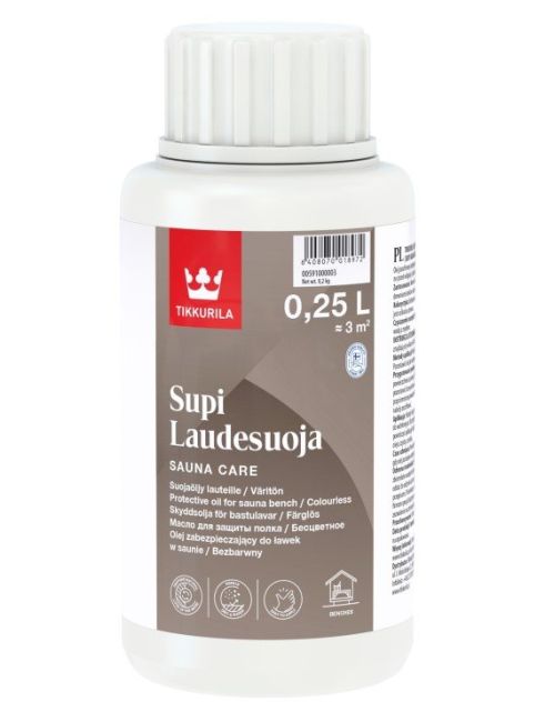 SUPI LAUDESUOJA Apsauginė priemonė pirčių suoliukams nuo drėgmės ir nešvarumų.LAUDESUOJA įsigeria į medieną ir palieka minkštą apsauginį sluoksnį.Apdorotus paviršius lengva išlaikyti higieniškai švarius. Bespalvis , bet gali keisti medienos atspalvį.Pritaikymas: pirčių suoliukai ir kiti mediniai paviršiai pirtyse.Išeiga: 8-15 kv.m./1LSkiediklis ir įrankių valiklis: vanduoNaudojimo instrukcija: nešvarias lentas nuplaukite ir leiskite išdžiūti. Labai purvinus ir patamsėjusius suoliukus pašlifuokite. Priemonę užtepkite teptuku arba švariu skudurėliu ir leiskite įsigerti į medieną. Jeigu visa priemonė įsigeria, tuomet užtepkite pakartotinai. Užkaitinkite pirtį ir skudurėliu pašalinkite nuo paviršiaus priemonės likutį.Džiuvimo trukmė: priemonė įsigeria į medieną. Įsigėrimo trukmė priklauso nuo medienos.Dažymo sąlygos: paviršius turi būti sausas, oro temperatūra ne žemesnė kaip +5C, santykinis drėgnumas ne didesnis kaip 80%.Aplinkos ir darbo sauga: nepilkite priemonės į kanalizacijos sistemas, vandens telkinius ir dirvą. Tuščius indelius atiduokite perdirbimui arba į sąvartyną. Naudokite odos ir akių apsaugos priemones.SAUGOKITE NUO VAIKŲ.SAUGOKITE NUO ŠALČIO !Gamintojas: TIKKURILA PAINTS OY, Vantaa, Suomija.Pirtims naudojama lengva mediena yra labai porėta ir dėl to tepli medžiaga. Į medieną įsigėrusį purvą visiškai pašalinti galima tik mechaniškai. Pirtyje naudojamos dviejų tipų medienos apsaugos priemonės, tai:Medienos apsaugos priemonės parafino aliejų pagrindu. Šios priemonės įsigeria į medieną ir uždaro jos poras – purvas lieka viršuje. Šia priemone apdorota mediena lengvai valosi muilo tirpalu. Labai įsisenėjusį purvą galima valyti ir kitomis priemonėmis, tačiau po to būtina gausiai nuplauti vandeniu, gerai išdžiovinti ir iš naujo nutepti šiomis priemonėmis. Keičia medienos spalvą, ji tampa sodresnė, išryškėja rievės (drebulė pilkėja). Malonu tai, kad po apdorojimo lieka natūralus medinis paviršius. Savo klientams rekomenduojame ja dengti visus paviršius. Skirtingų gamintojų skiriasi klampumu .Tikkurila- skystesnė ir daugiau susigeria, Meksa – tirštesnė, lengviau dengiasi, geresnė išeiga.Alkidinis lakas. Tai vandeniu skiedžiama medienos apsaugos priemonė, karštoje pirtyje virstanti elastinga, neatsparia trinčiai plėvele. Gerai plaunasi tik kambario temperatūroje. Negalima dengti pirties gultų!Skirtingų gamintojų skiriasi klampumu. Asmeninės patirties dėl išeigos neturime.