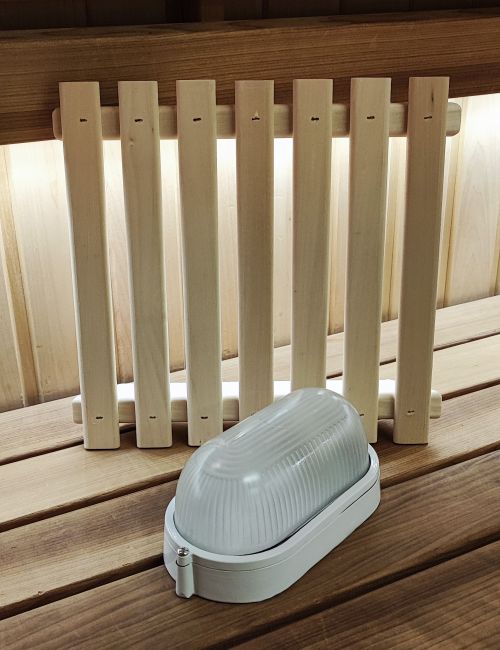 Kpmplektą sudaro: Karščiui ir drėgmei atsparus pirties šviestuvas ir liepinis šviestuvo gaubtas. Šviestuvo korpusas iš aliuminio. IP54, maks. 125oC, maks. 60W, cokolis – E27. Matmenys: Ilgis 210mm, plotis 106mm, aukštis 85mm. Šviestuvo gaubtas liepinis, montuojamas pirties kampe, kabinamas ant 2 kabliukų . Gaubto aukštis 30cm, plotis 32cm.