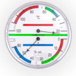Termometras ir higrometras Fischer. Temperatūra iki 120 laipsnių, drėgmė iki 60 procentų. Matmenys – 17cm x 17cm.  Gamintojas Fischer, Vokietija.